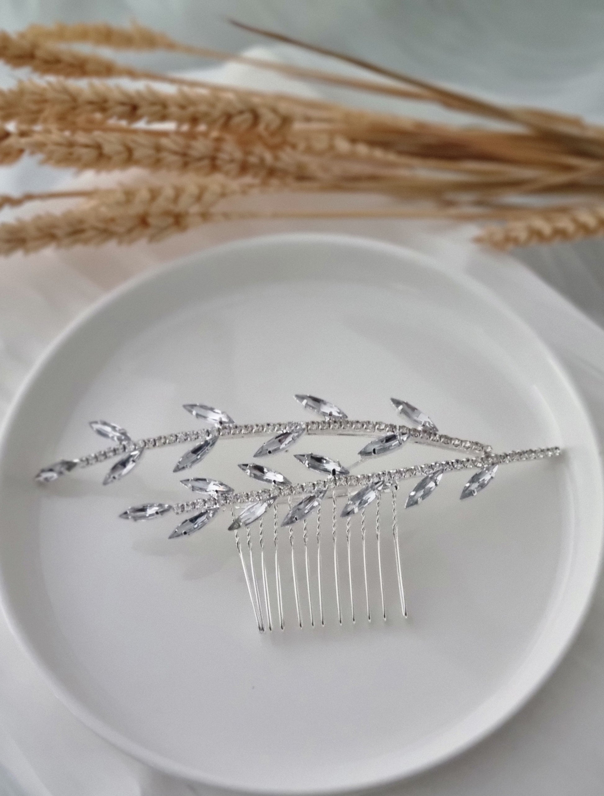 Ce peigne INES orné de branches de feuillage et de strass ajoutera une touche élégante et scintillante à votre coiffure. Parfait pour les occasions spéciales ou pour simplement ajouter une touche de glamour à votre look quotidien. Faites-vous remarquer avec ce magnifique peigne!